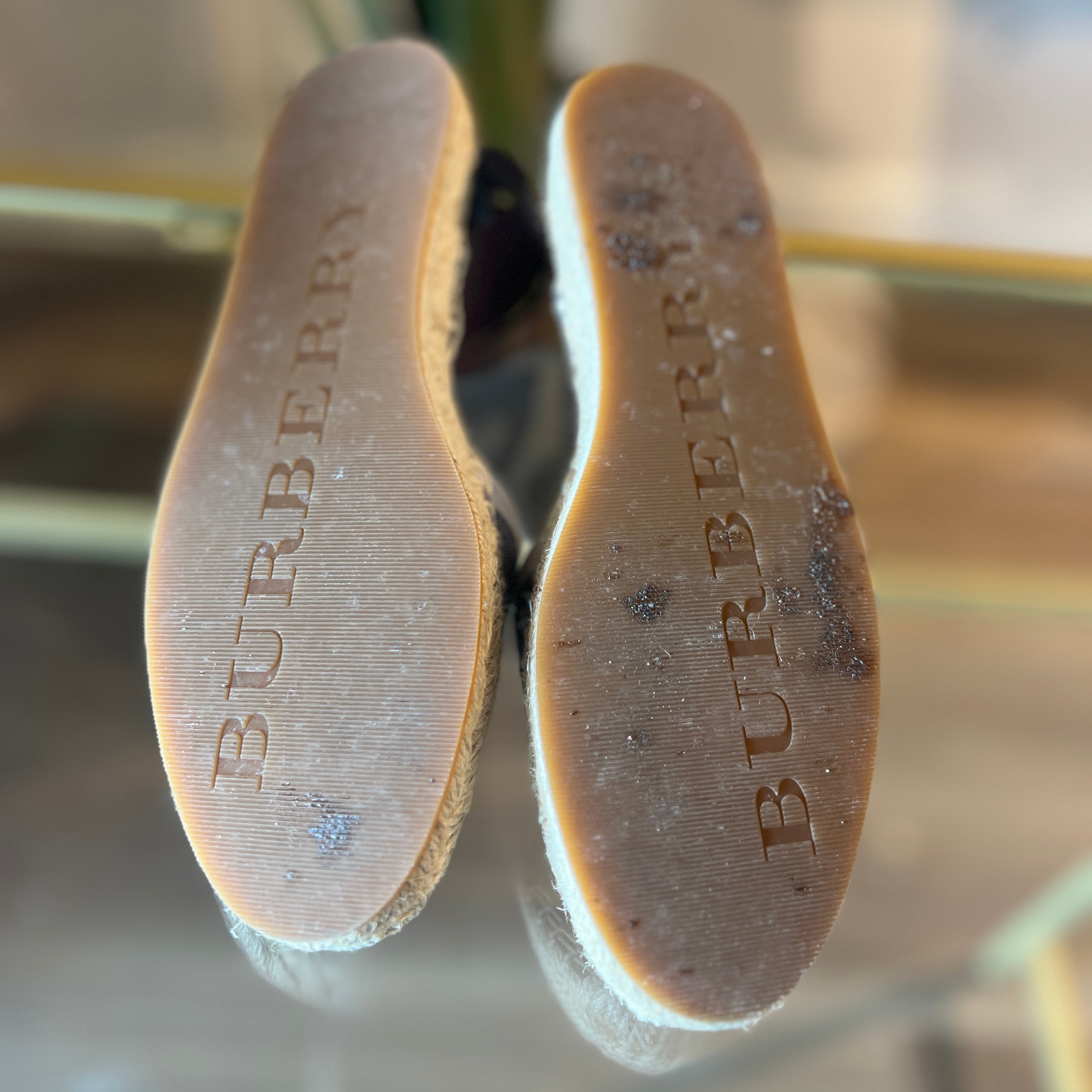 - Jute sole shows mild fraying or darkening