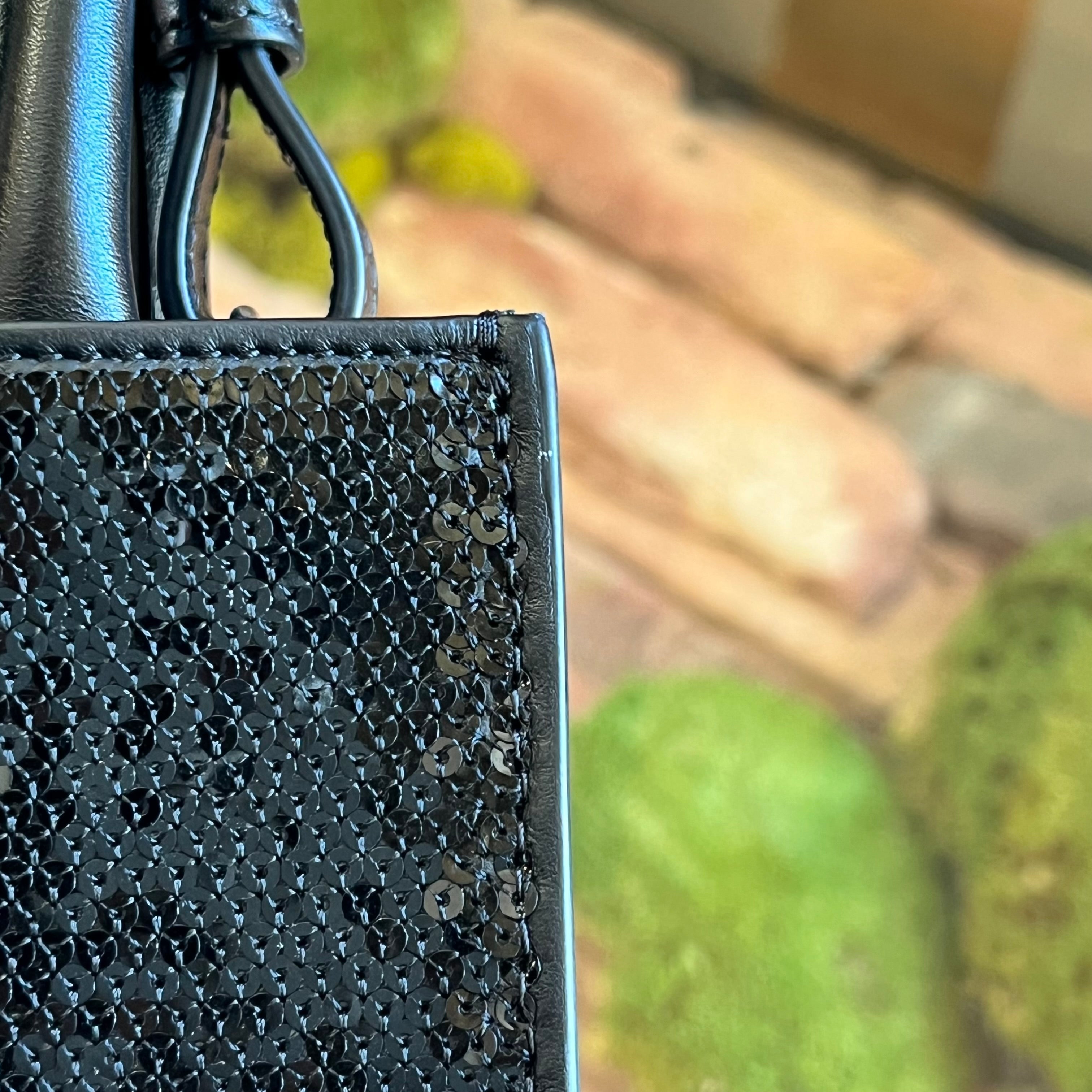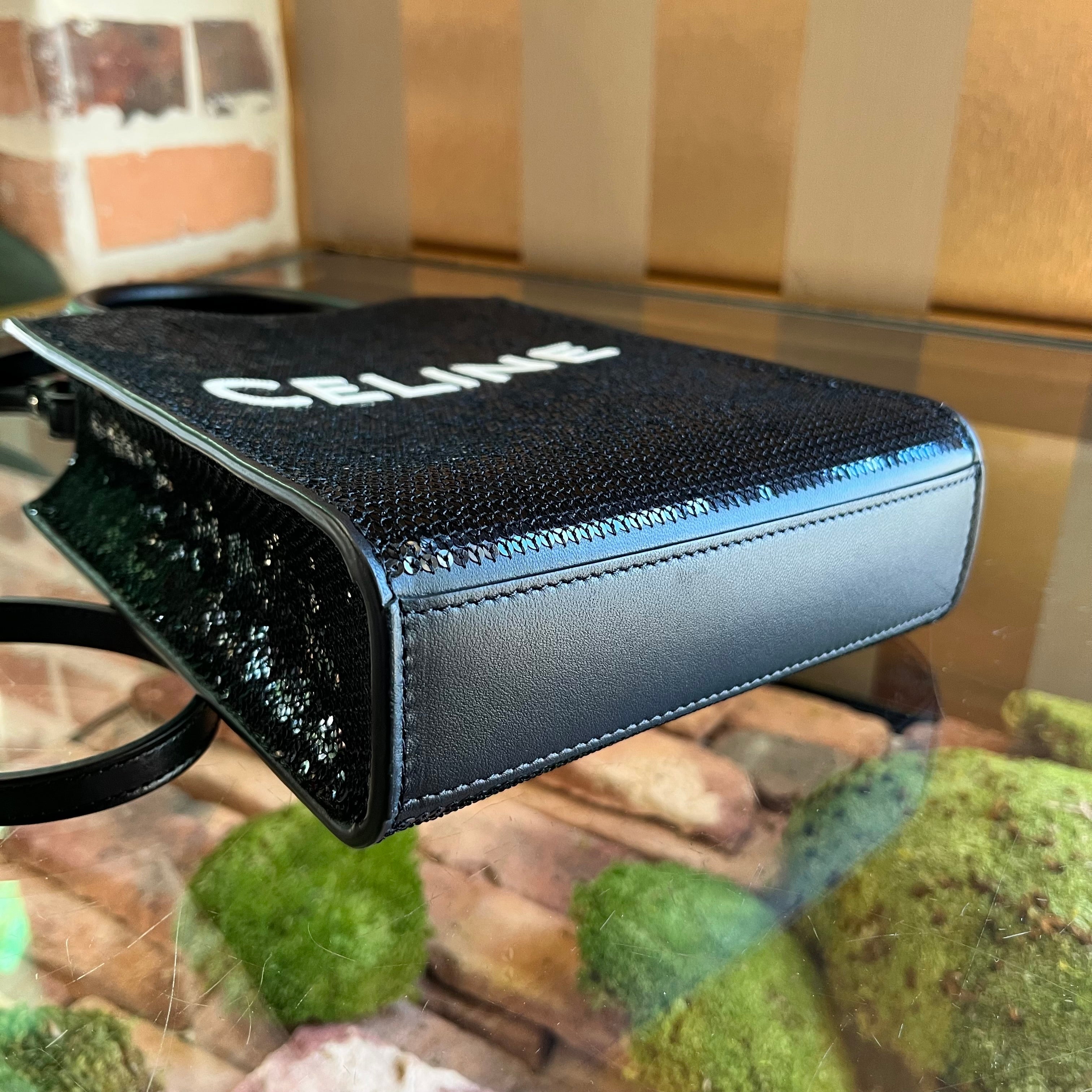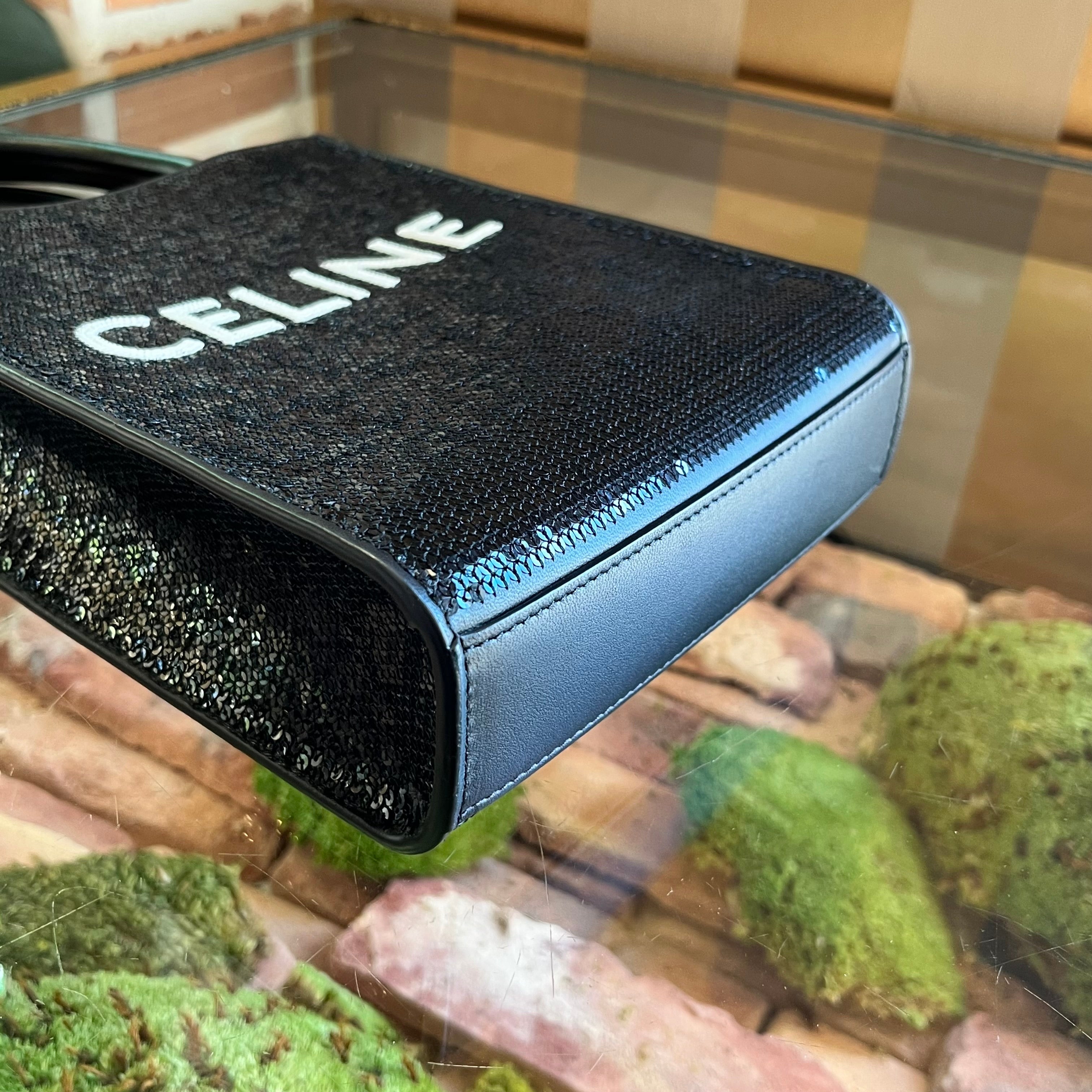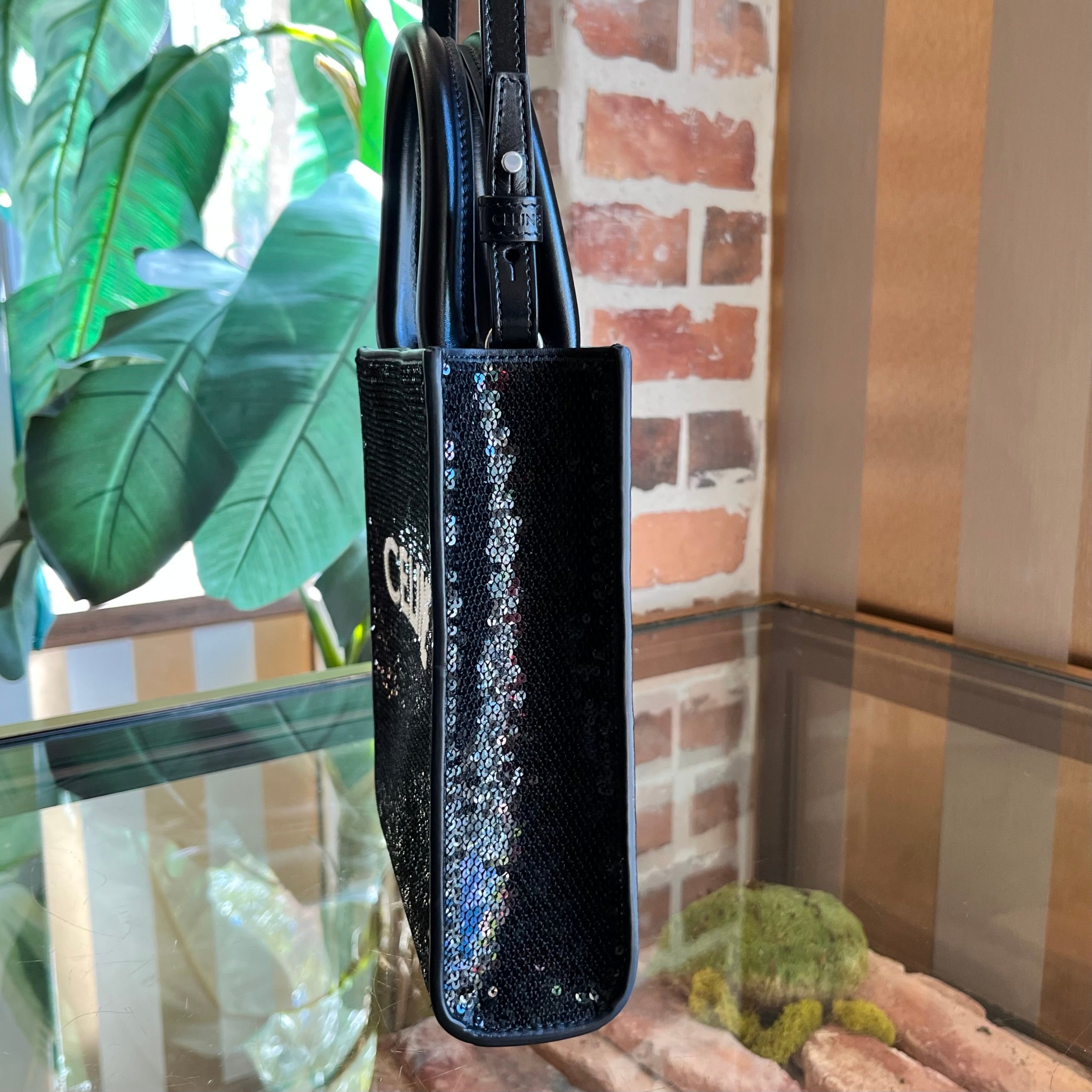 Elevate your style with the CELINE Cabas Mini Sequin Vertical Tote. Its compact, vertical design offers a chic silhouette, while the shimmering sequins add a refined touch of glamour. Perfect for day-to-night wear, this tote combines elegance with practicality, making it a distinguished accessory for any sophisticated wardrobe. B+ Very Good Condtion