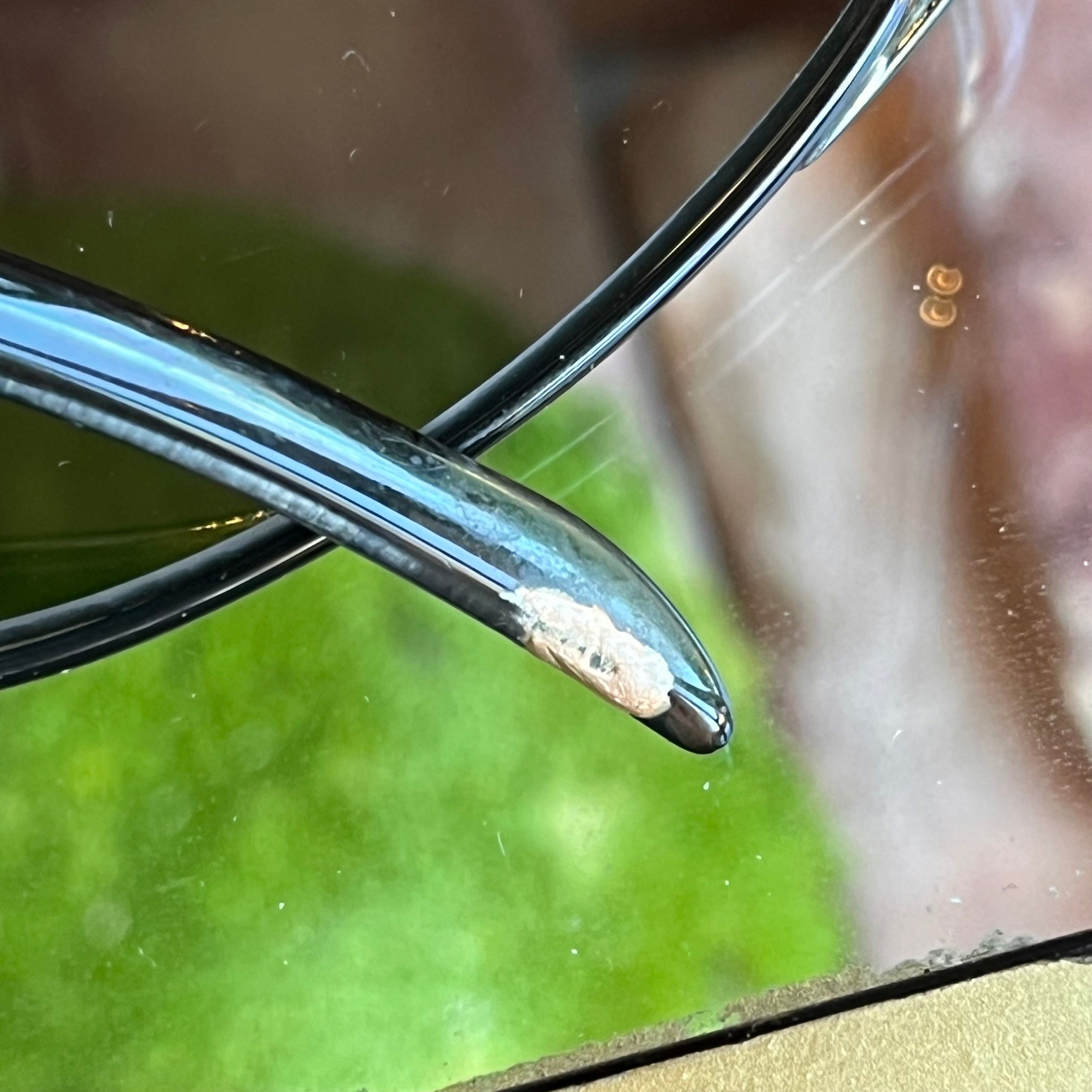 - Exterior: The lenses displays hairline scratches which does not affect vision at all. The acetate is vibrant and refined with scratches, moderate rubbing. Wear to the nose pads. The left temple arm could stand to be tightened if desired after purchase. Overall they're in very good condition.