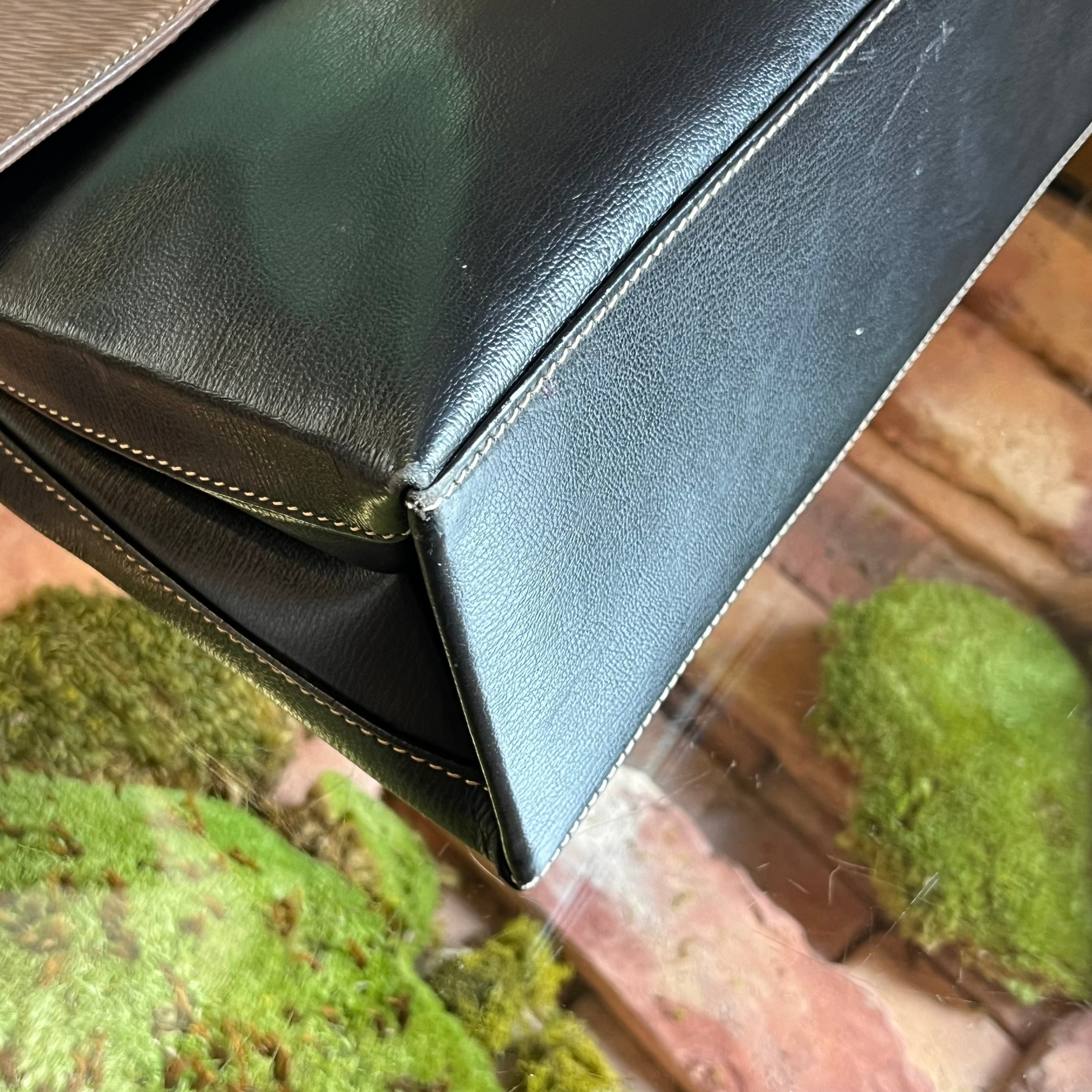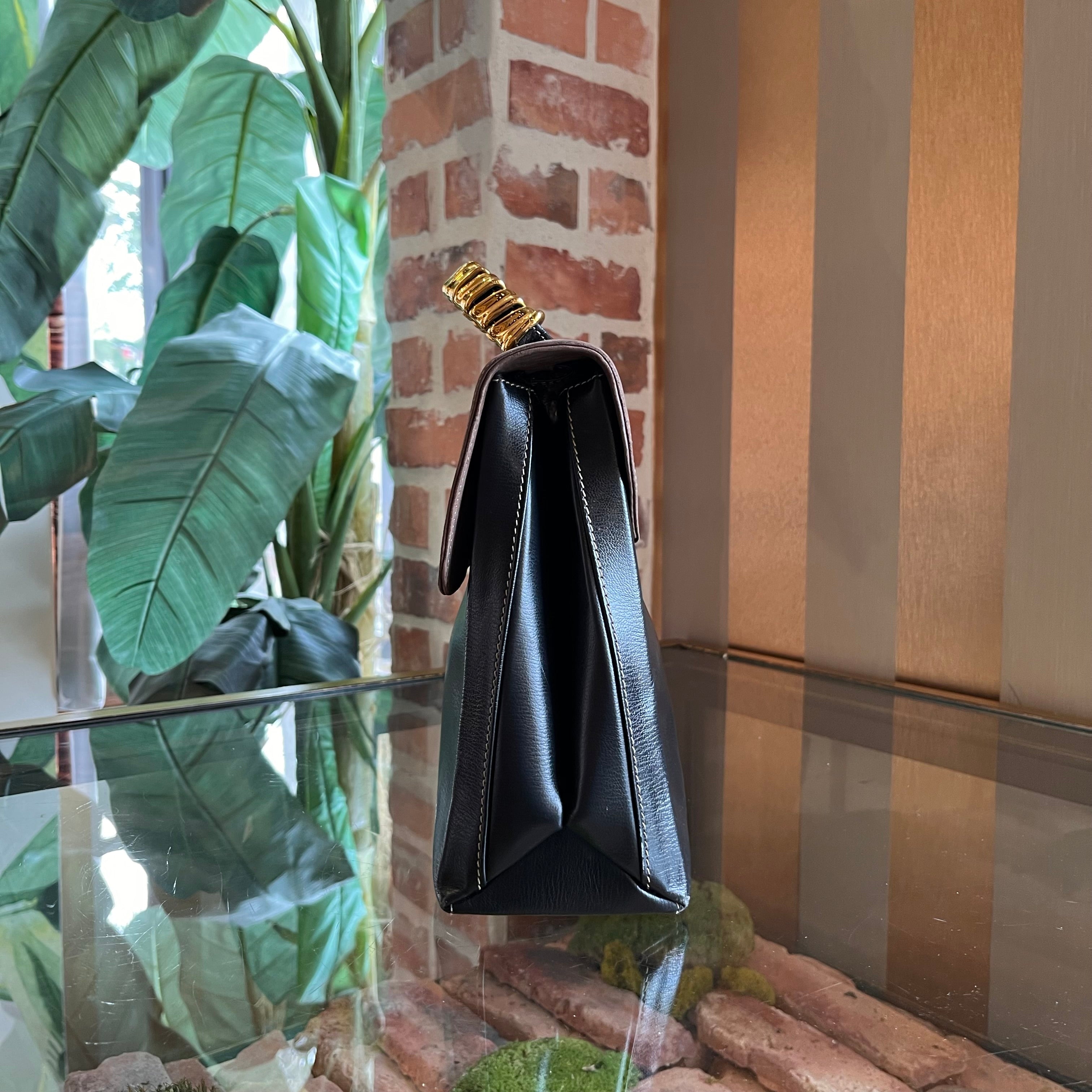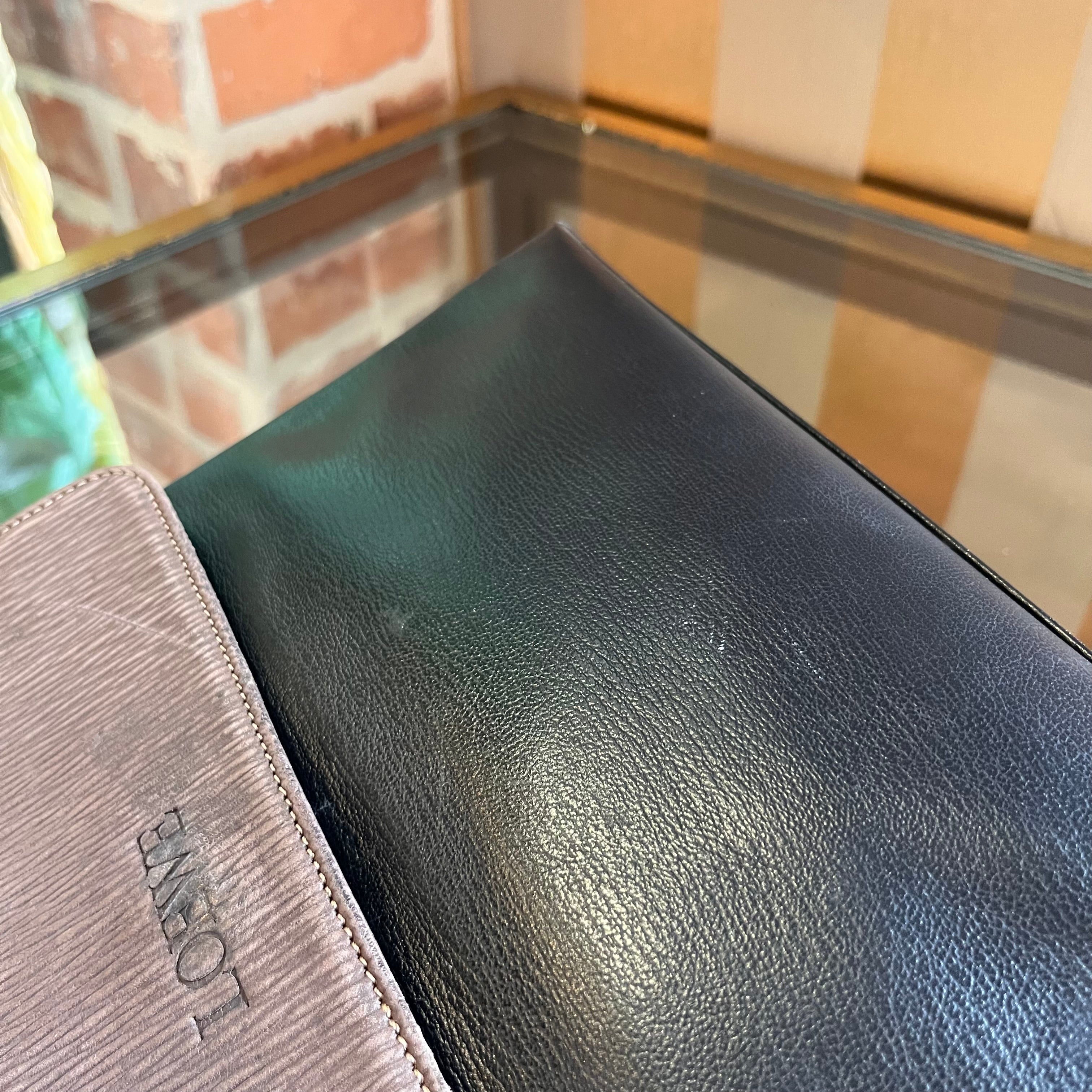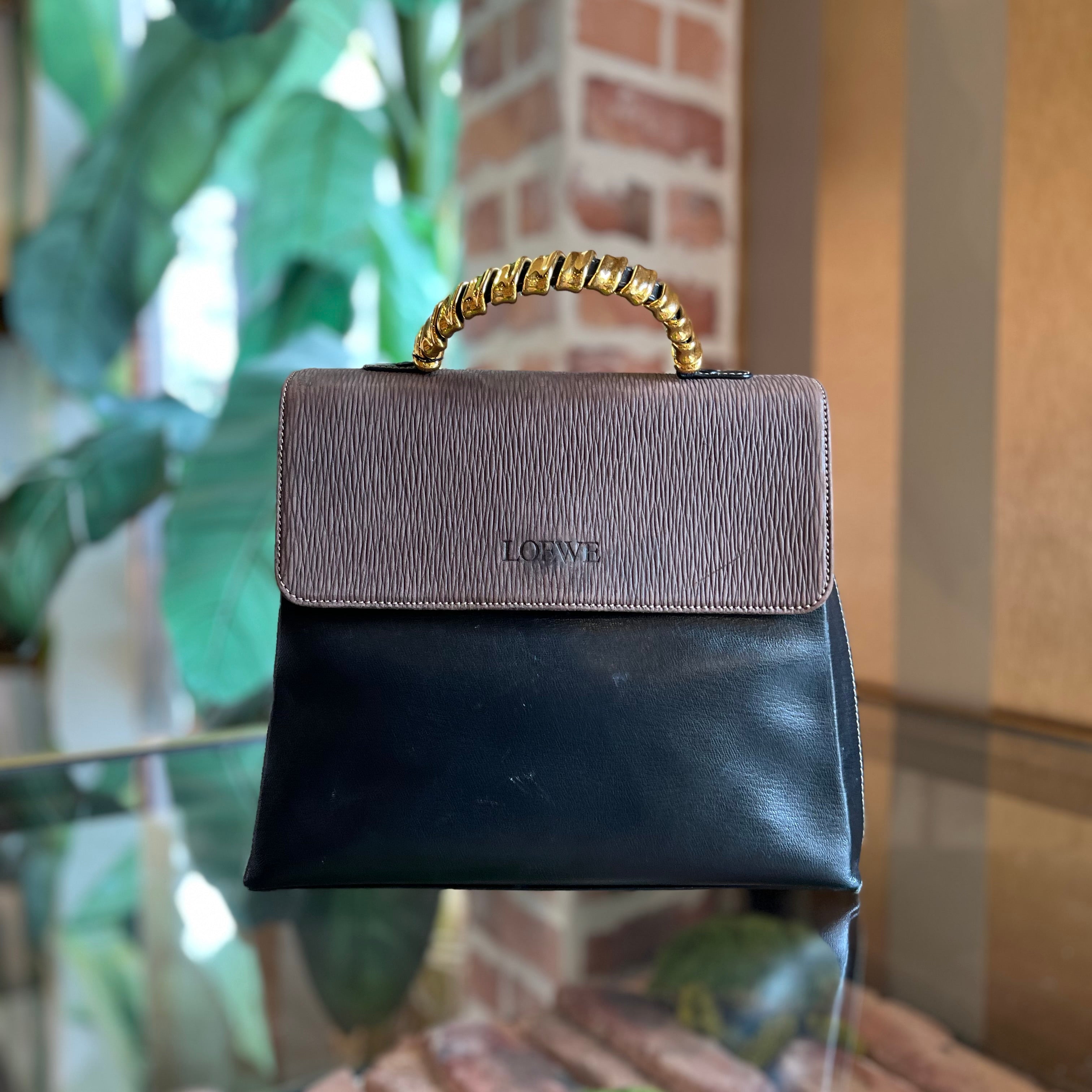 Description: This gorgeous Loewe is sure to be a showstopper! With a beautiful gold handle, a structured body, and its vintage inspired style, this is a classy bag. In good condition, with clean corners and a clean interior, a black spot on the top left side, some lighter spots towards the bottom, and a dark scuff on the logo on the front.