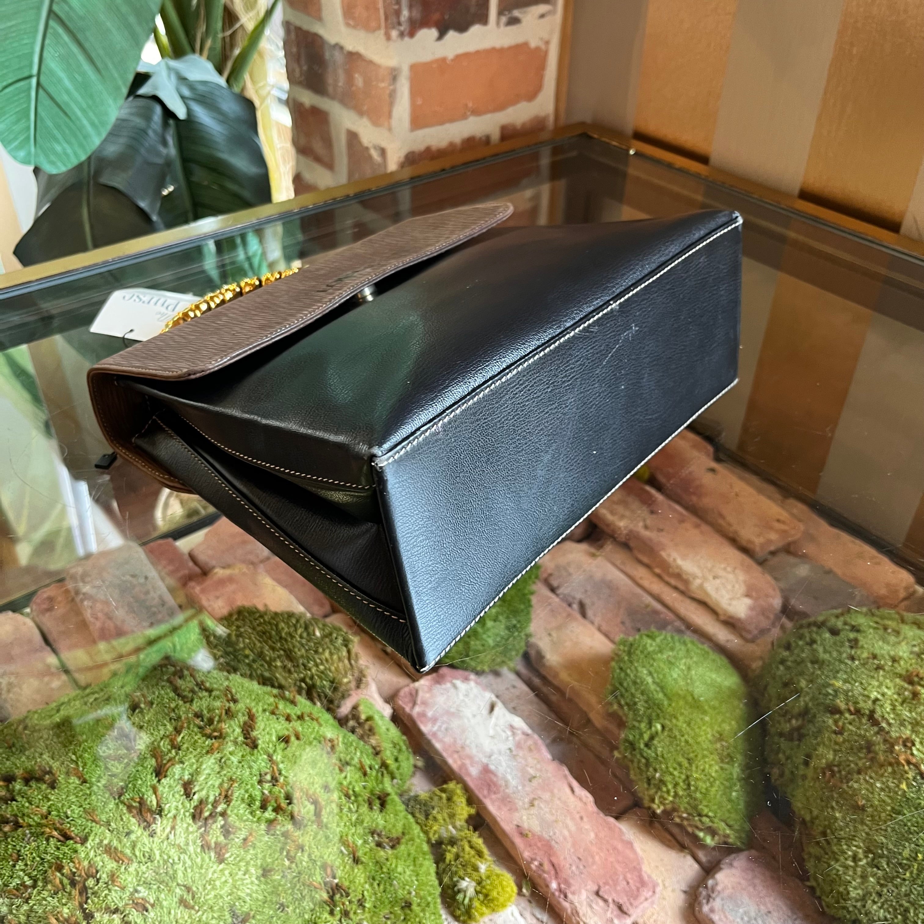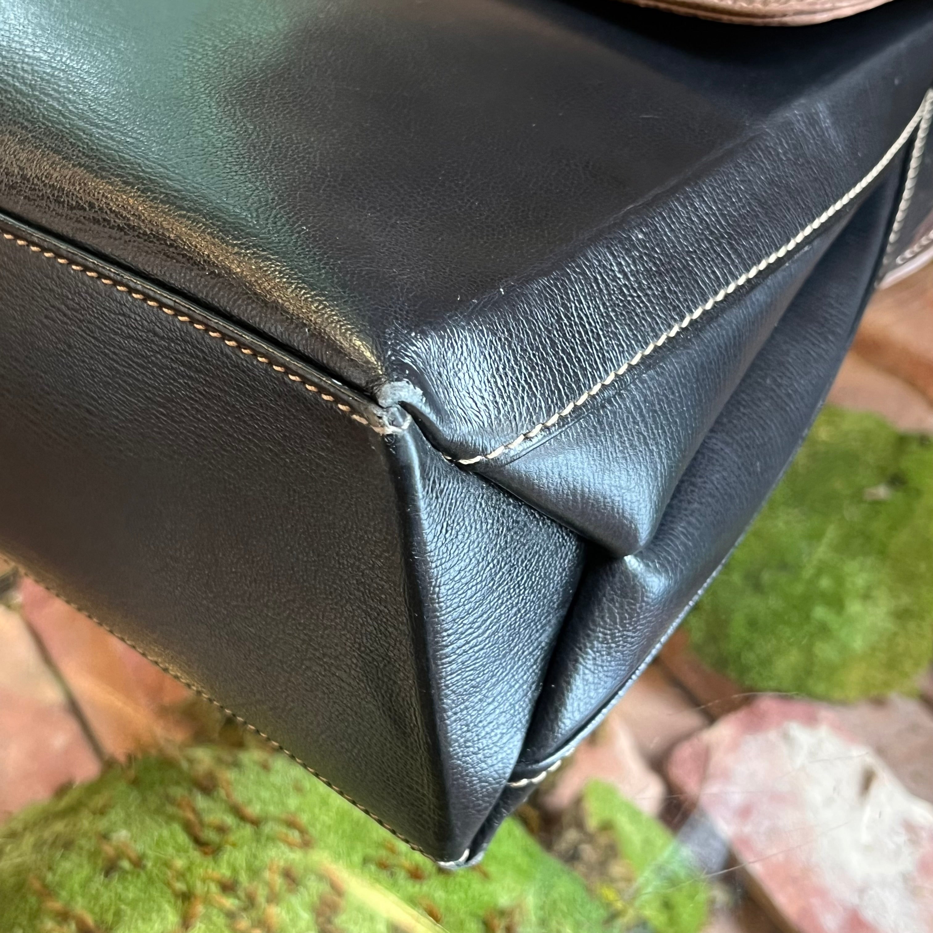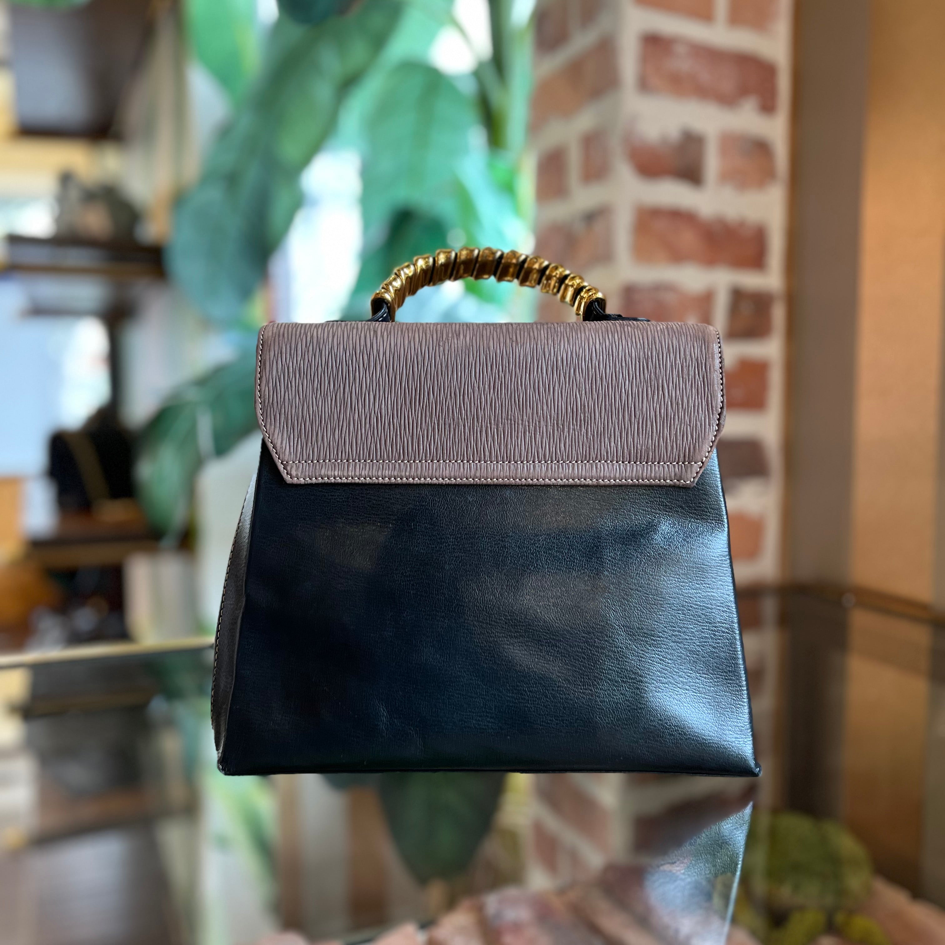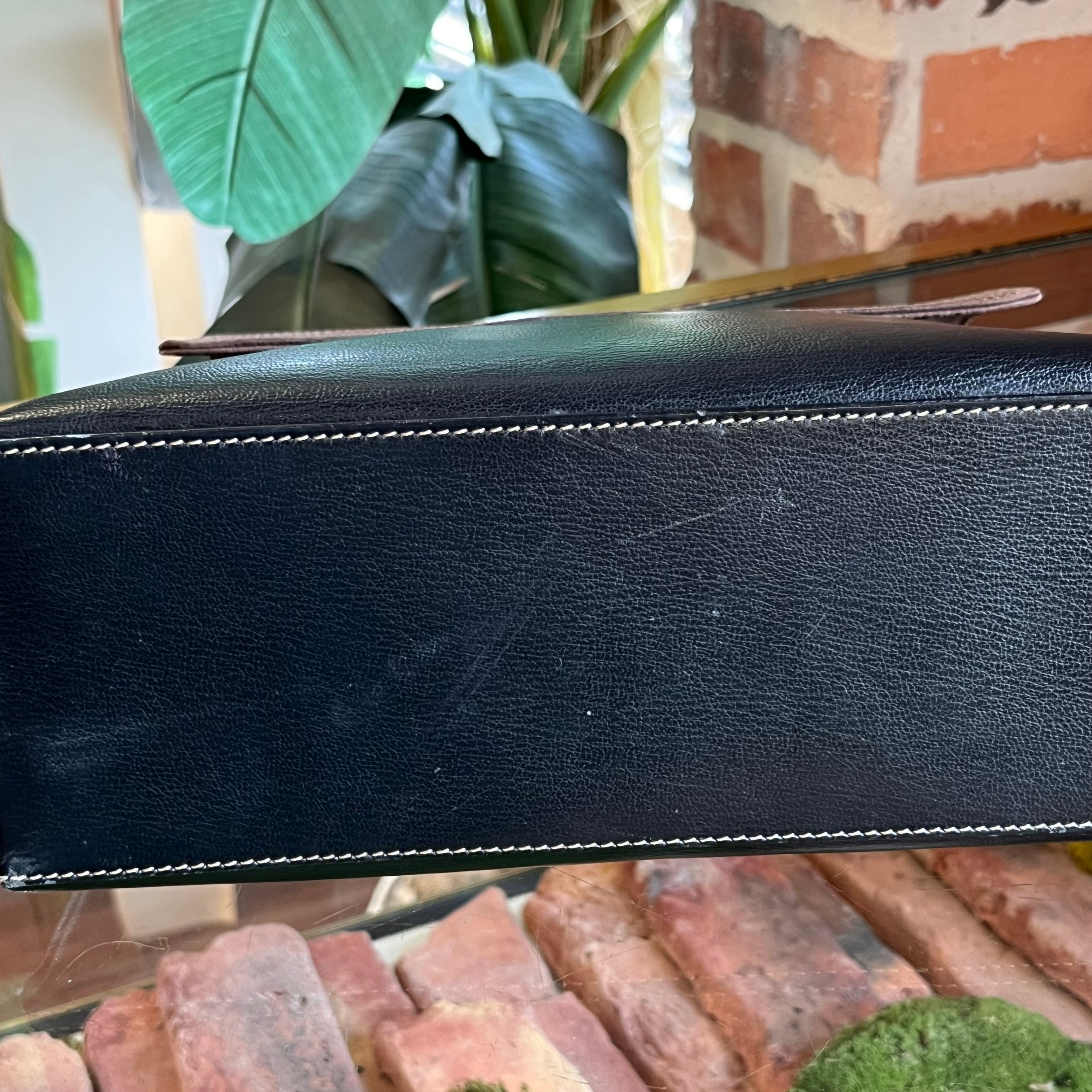 Description: This gorgeous Loewe is sure to be a showstopper! With a beautiful gold handle, a structured body, and its vintage inspired style, this is a classy bag. In good condition, with clean corners and a clean interior, a black spot on the top left side, some lighter spots towards the bottom, and a dark scuff on the logo on the front.